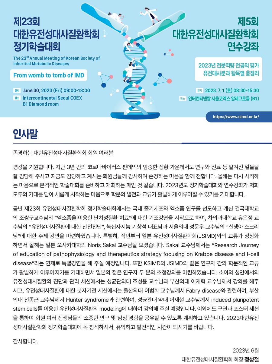 [대한유전성대사질환학회] 제23회 정기학술대회 및 제5회 연수강좌