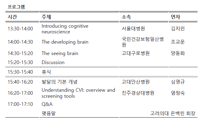 이번 집담회에서는 발달의 기본 개념 뿐 아니라, ‘시각’이라는 주제를 중심으로 Cortical Visual Impiarment (CVI) 에 대해 다루고자 합니다.